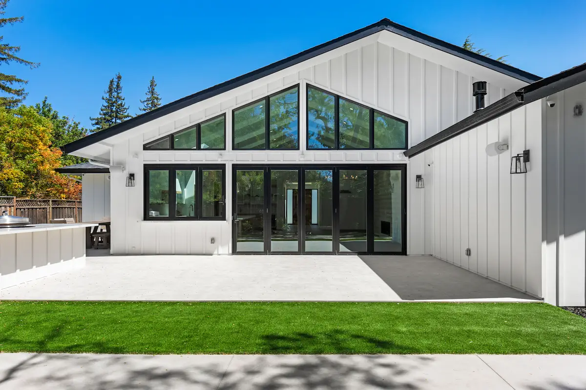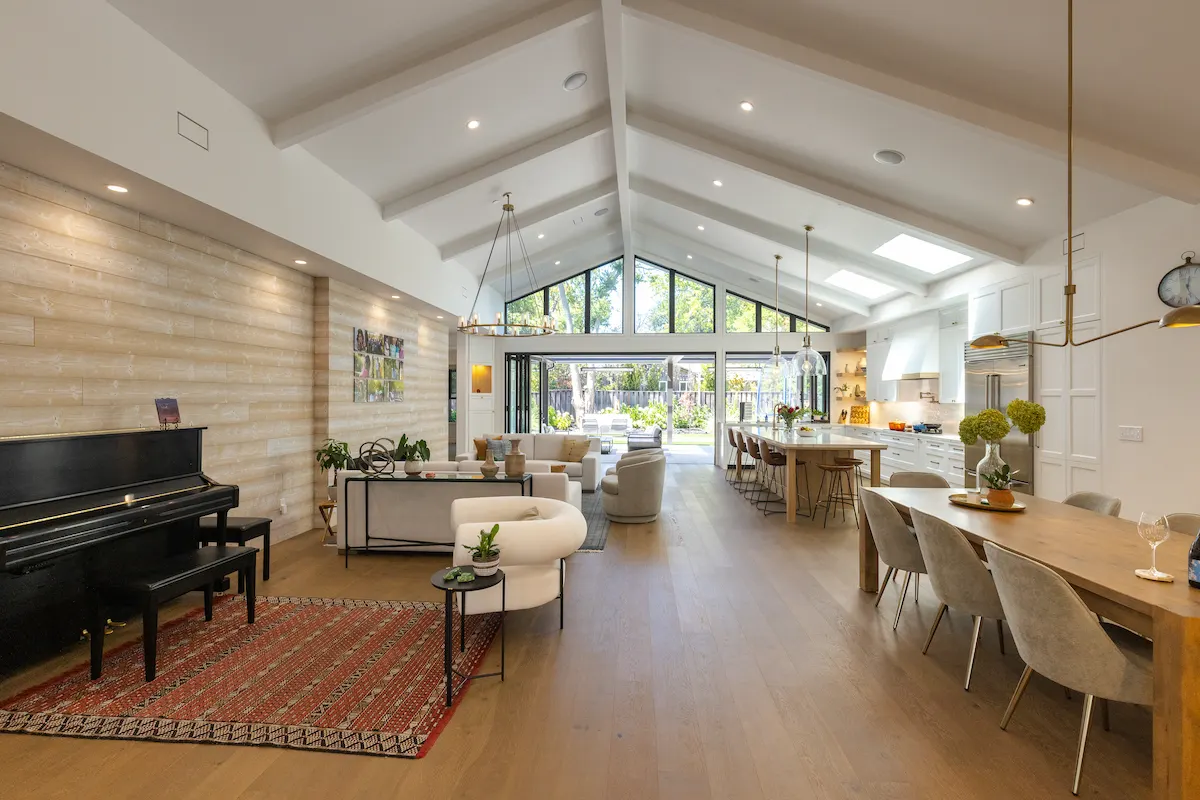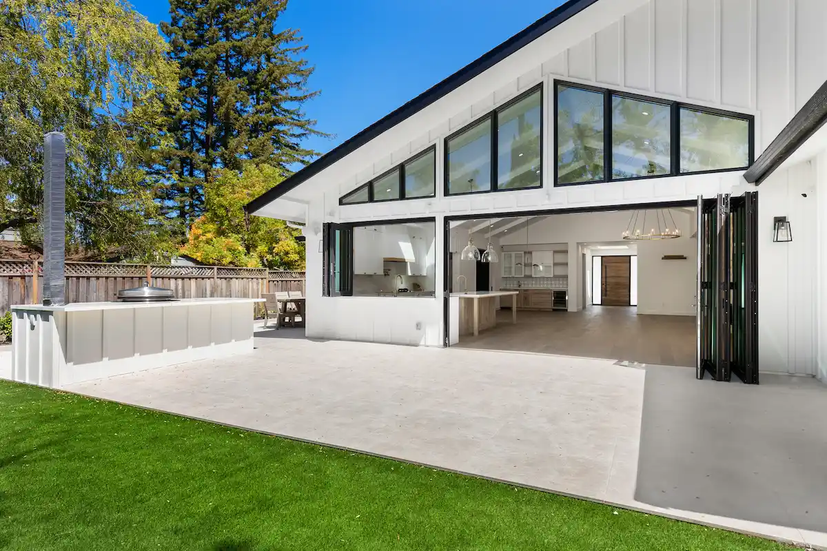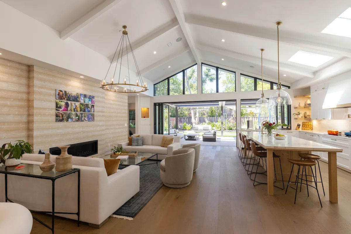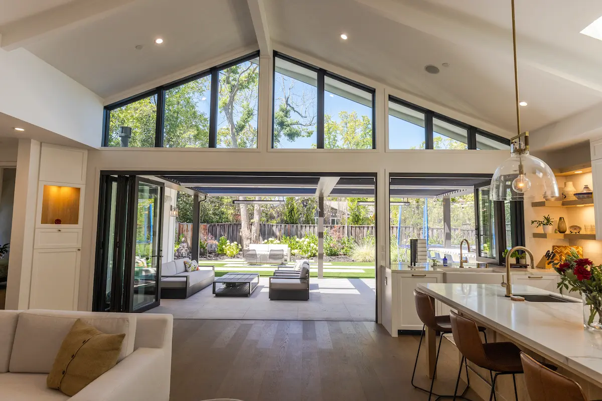 A seamless blend of indoor and outdoor living with its airy, open-concept design. Expansive windows and vaulted ceilings fill the space with natural light, while glass doors lead to a beautifully landscaped yard and grill station, perfect for gatherings. Modern finishes and thoughtful touches create a warm, inviting atmosphere throughout.