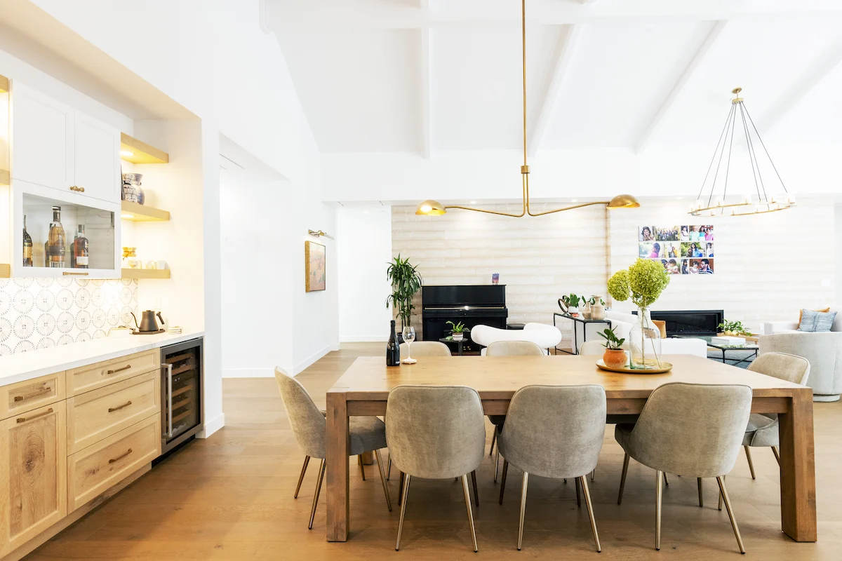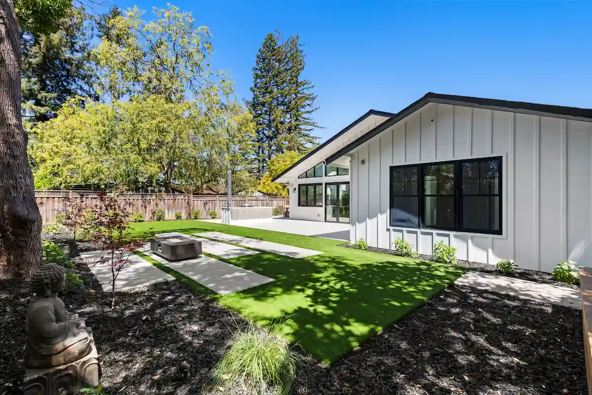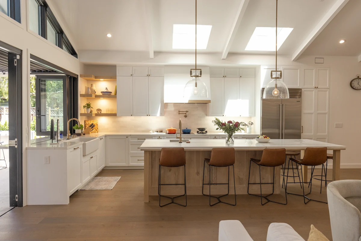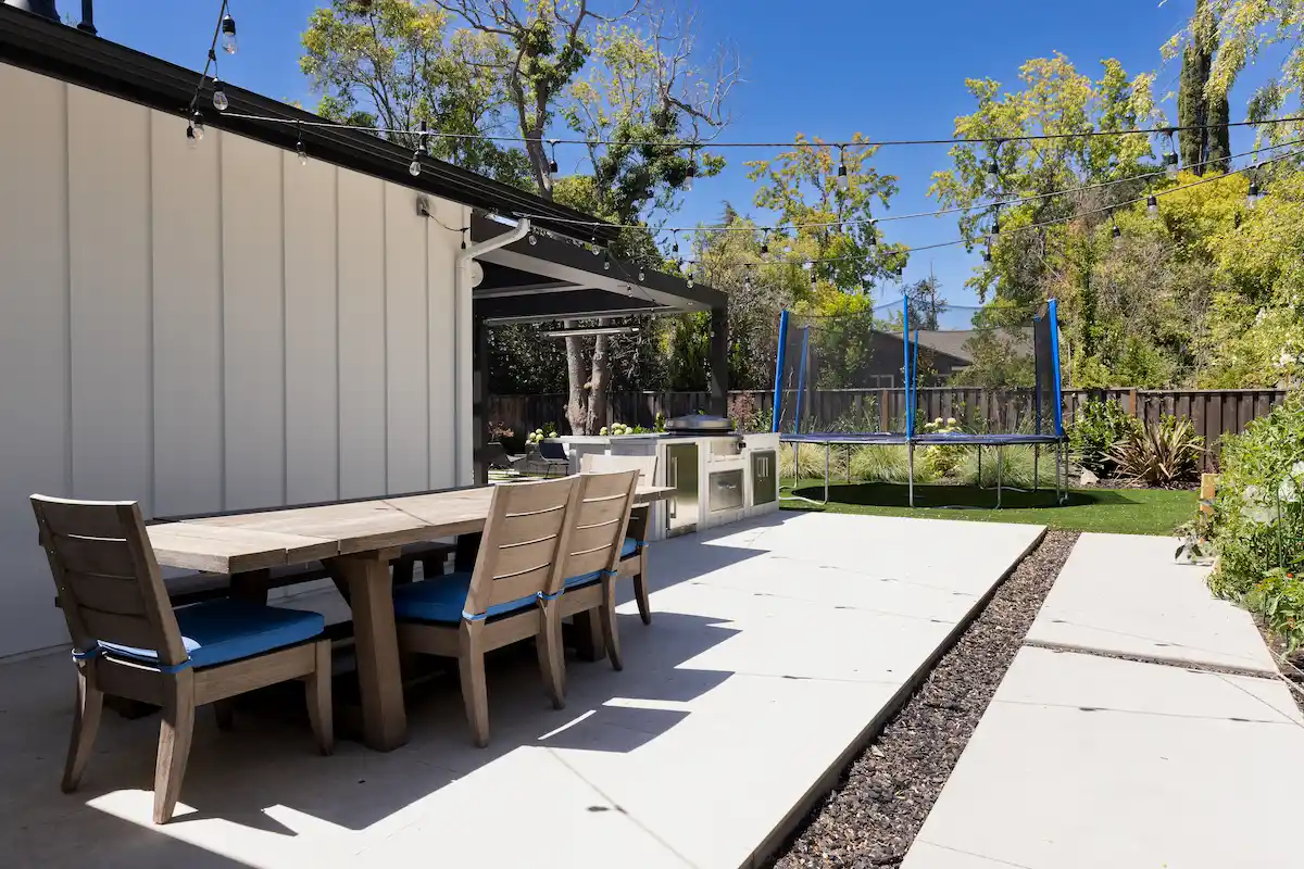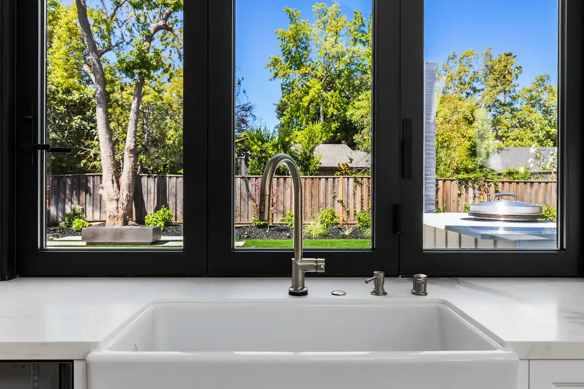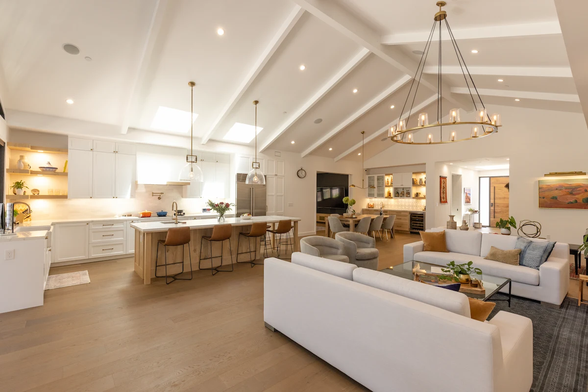 A seamless blend of indoor and outdoor living with its airy, open-concept design. Expansive windows and vaulted ceilings fill the space with natural light, while glass doors lead to a beautifully landscaped yard and grill station, perfect for gatherings. Modern finishes and thoughtful touches create a warm, inviting atmosphere throughout.