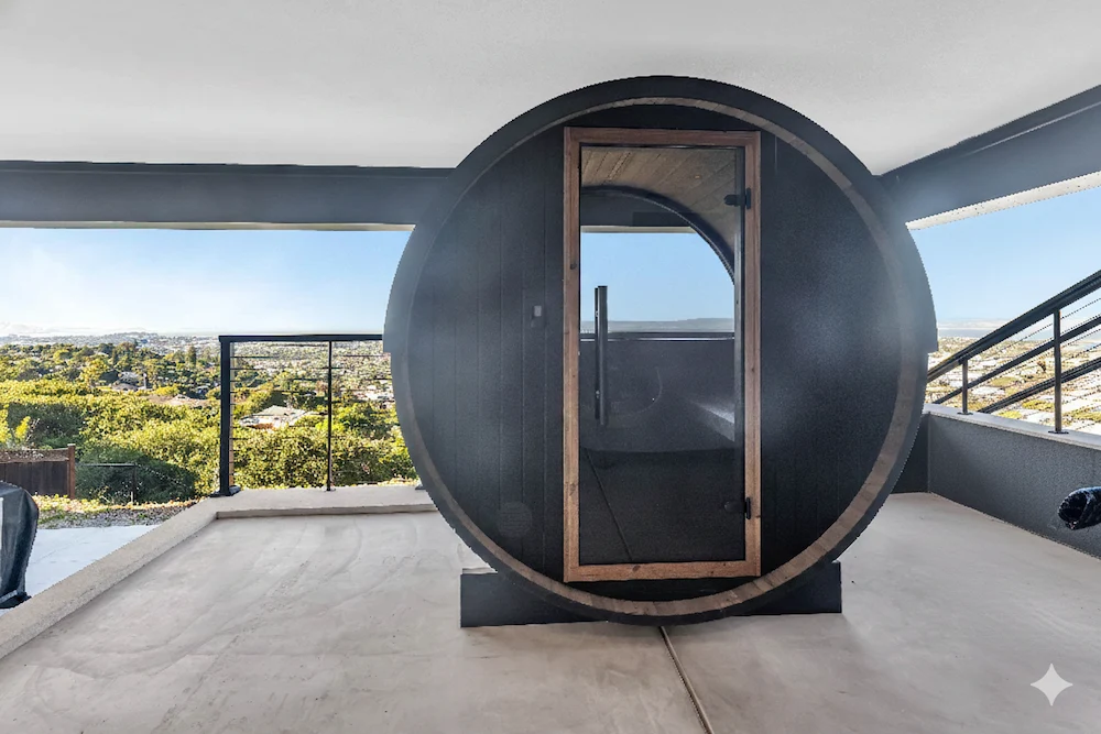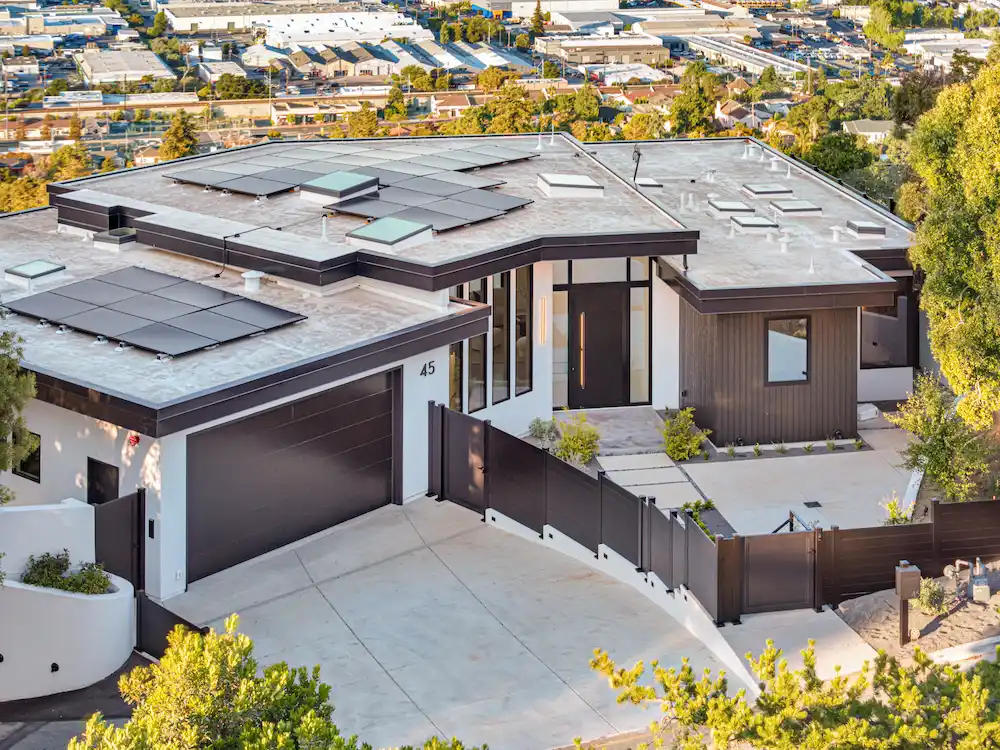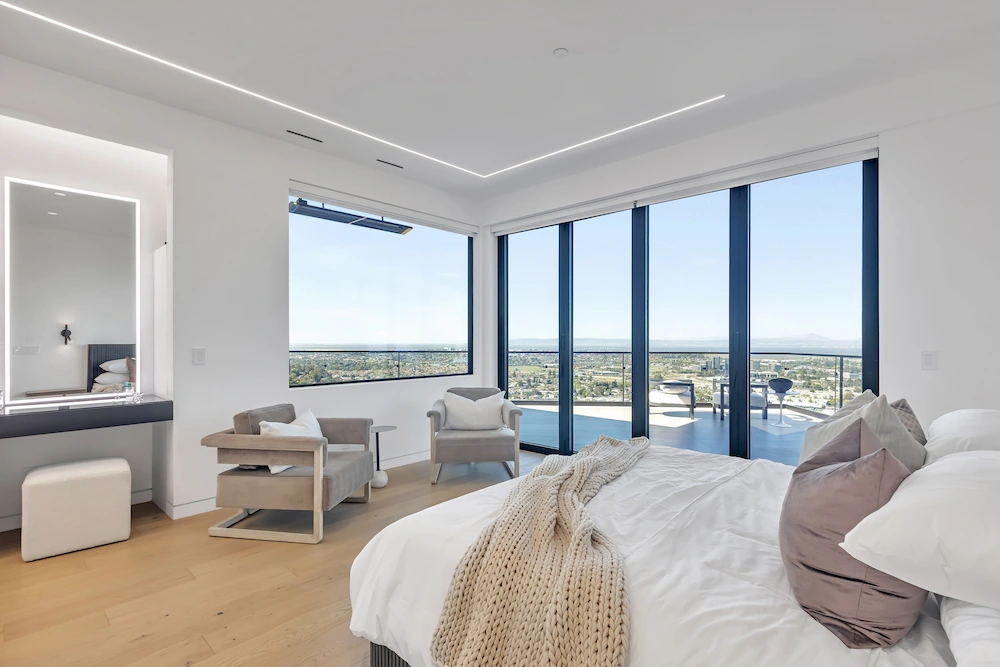 A sleek hillside home with modern design, expansive glass, stunning views, and a luxurious open-concept interior
